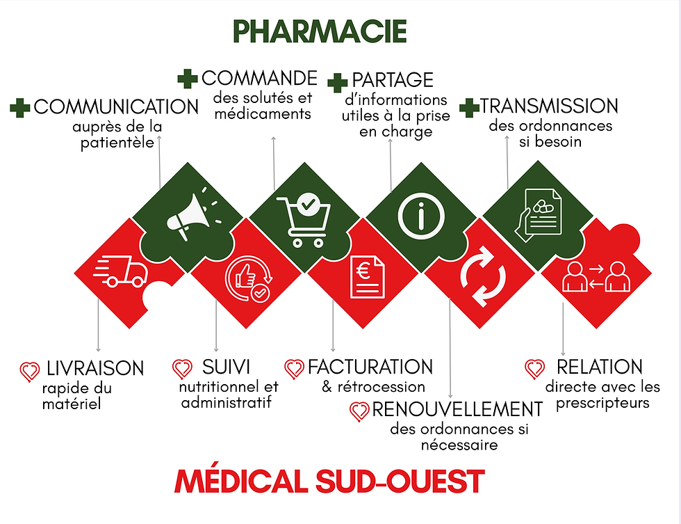 Médical Sud-Ouest accompagne les officines partenaires dans la prise en charge à domicile des patients, en apportant des solutions fiables en perfusion, nutrition et coordination des soins, dans le respect du rôle de chaque professionnel de santé.
